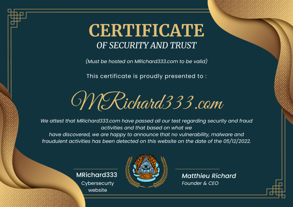 This will be linking your website to the page that we will create for you to confirm that the certificate is valid and has been emitted by MRichard333.com (us).